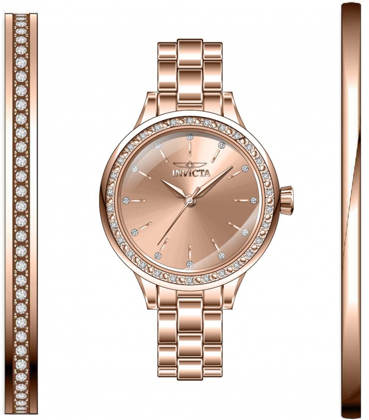 Rose gold-tone stainless steel case with a rose gold-tone stainless steel bracelet. Fixed rose gold-tone crystal set bezel. Rose gold-tone dial with rose gold-tone hands and crystal and index hour markers. Dial Type: Analog. Hattori Caliber PC21 quartz movement. Scratch resistant flame fusion crystal. Pull / push crown. Solid case back. Round case shape, case size: 28 mm, case thickness: 12 mm. Band width: 10 mm, band length: 6 inches. Fold over clasp. Water resistant at 100 meters / 330 feet. Functions: hour, minute, second. Dress watch style. Watch label: Japan Movt. Invicta Angel Quartz Crystal Rose Gold Dial Ladies Watch 29315.
