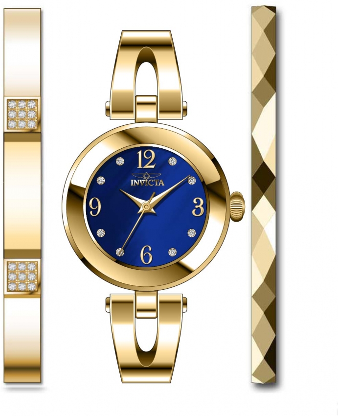 Gold-tone stainless steel case with a gold-tone stainless steel bracelet. Fixed gold-tone stainless steel bezel. Blue dial with gold-tone hands and crystal and Arabic numeral hour markers. Dial Type: Analog. Hattori Caliber PC21 quartz movement. Scratch resistant flame fusion crystal. Pull / push crown. Solid case back. Round case shape, case size: 28 mm, case thickness: 12 mm. Band width: 12 mm, band length: 6.5 inches. Jewelry clasp. Water resistant at 100 meters / 330 feet. Functions: hour, minute, second. Casual watch style. Watch label: Japan Movt. Invicta Angel Quartz Crystal Blue Dial Ladies Watch 29332.