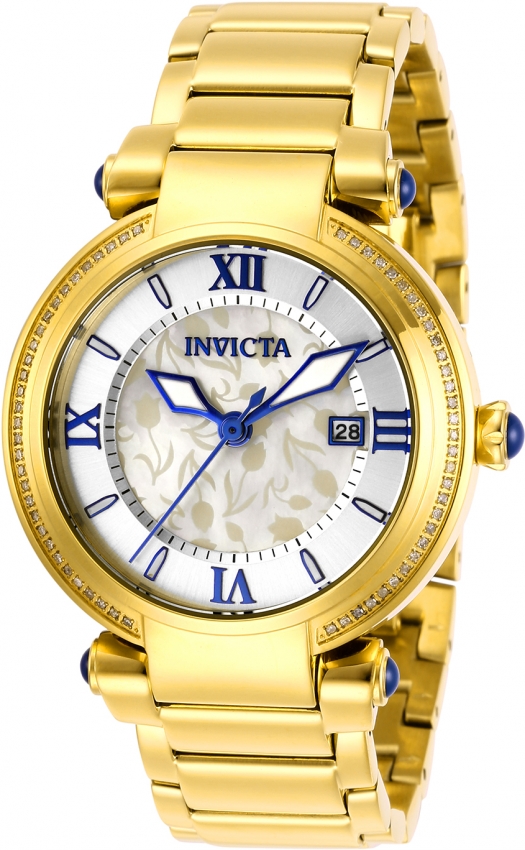 Gold-tone stainless steel case with a gold-tone stainless steel bracelet. Fixed gold-tone diamond set bezel. White and silver-tone mother of pearl dial with blue hands and Roman numeral and index hour markers. Minute markers around the outer rim. Dial Type: Analog. Luminescent hands and markers. Date display at the 3 o'clock position. Hattori Caliber PC32A quartz movement. Scratch resistant flame fusion crystal. Pull / push crown. Solid case back. Round case shape, case size: 40 mm, case thickness: 11 mm. Band width: 22 mm, band length: 7.75 inches. Fold over clasp. Water resistant at 50 meters / 165 feet. Functions: date, hour, minute, second. Dress watch style. Watch label: Japan Movt. Invicta Angel Quartz Diamond Ladies Watch 29876.