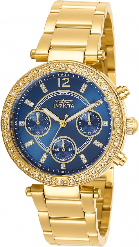 Gold-tone stainless steel case and bracelet. Fixed gold-tone bezel set with crystals. Blue dial with luminous gold-tone hands and crystal-set index hour markers. An Arabic numeral appears at the 12 o'clock position. Arabic numeral minute markers (at 5 minute intervals). Minute markers around the outer rim. Dial Type: Analog. Luminescent hands. Chronograph - three sub-dials displaying: 60 second, 60 minute and 24 hour. Hattori caliber VD54 quartz movement. Scratch resistant Flame Fusion crystal. Pull / push crown. Solid case back. Round case shape. Case size: 36 mm. Case thickness: 11 mm. Band width: 18 mm. Band length: 7 inches. Fold over clasp. Water resistant at 100 meters / 330 feet. Functions: chronograph, GMT, second time zone, hour, minute, second. Angel Series. Dress watch style. Watch label: Japan Movt. Invicta Angel Chronograph Quartz Crystal Blue Dial Ladies Watch 29925.