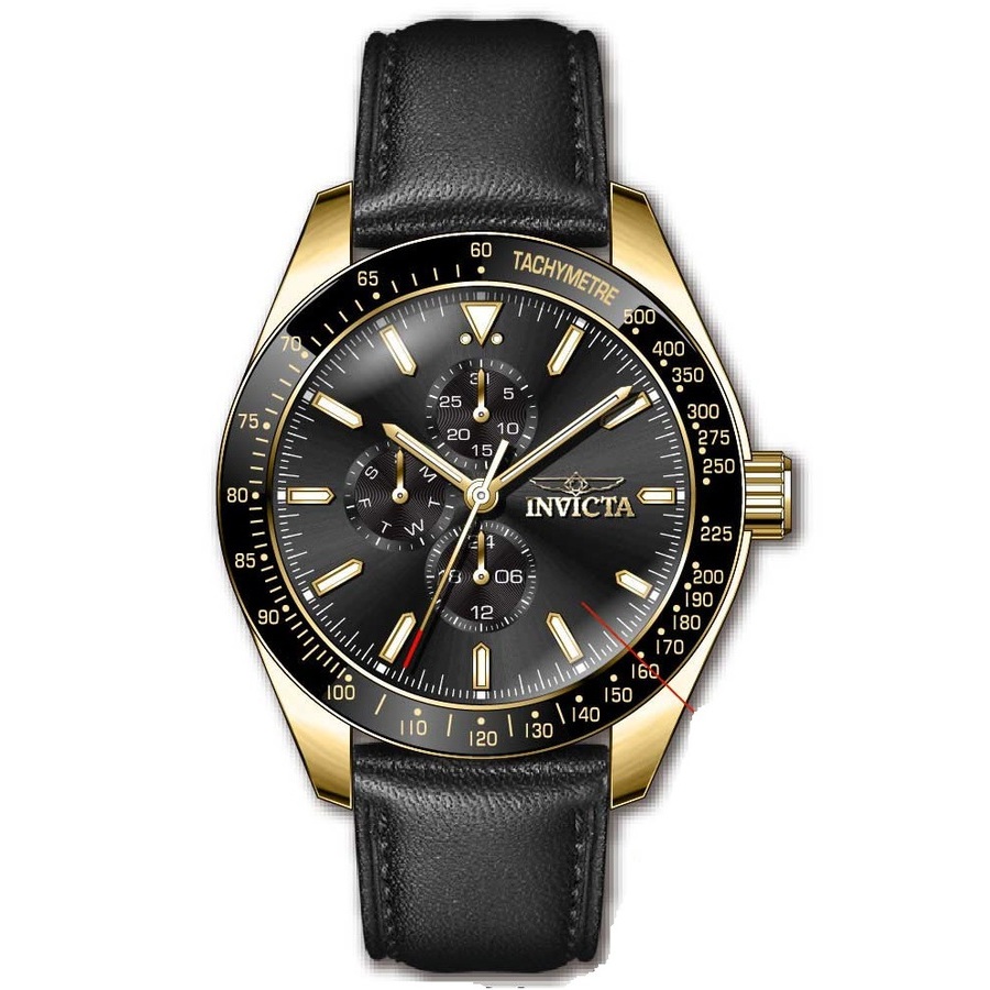 Gold-tone stainless steel case with a black leather strap. Fixed black stainless steel bezel. Black dial with luminous gold-tone hands and index hour markers. Minute markers around the outer rim. Dial Type: Analog. Luminescent hands and markers. Date display at the 6 o'clock position. Three sub-dials displaying: date, day and 24 hour. TMI Caliber VH67 quartz movement. Scratch resistant Flame Fusion crystal. Pull / push crown. Solid case back. Round case shape, case size: 45 mm. Band width: 22 mm, band length: 8.25 inches. Fold over clasp with a safety release. Water resistant at 100 meters / 330 feet. Functions: date, day, GMT, second time zone, hour, minute, second. Aviator Series. Casual watch style. Watch label: Japan Movt. Invicta Aviator Black Dial Mens Watch 38978.