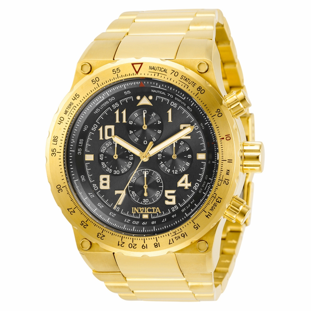 Yellow gold-tone stainless steel case and bracelet. Uni-directional rotating yellow gold-tone bezel with nautical consumption markings. Black dial with luminous yellow gold-tone hands and Arabic numeral and index hour markers. Minute Markers. Nautical markers around the outer rim. Dial Type: Analog. Luminescent hands and markers. Chronograph - four sub-dials displaying: 60 second, 30 minute and 1/10th of a second, 24 hour. Hattori caliber VD56 quartz movement. Scratch resistant Flame Fusion crystal. Pull / push crown. Solid case back. Round case shape. Case size: 50 mm. Band width: 32 mm. Band length: 7.25 inches. Fold over clasp. Water resistant at 100 meters / 330 feet. Functions: chronograph, GMT, second time zone, hour, minute, second. Aviator Series. Sport watch style. Watch label: Japan Movt. Invicta Aviator Chronograph Quartz Black Dial Mens Watch 31560.