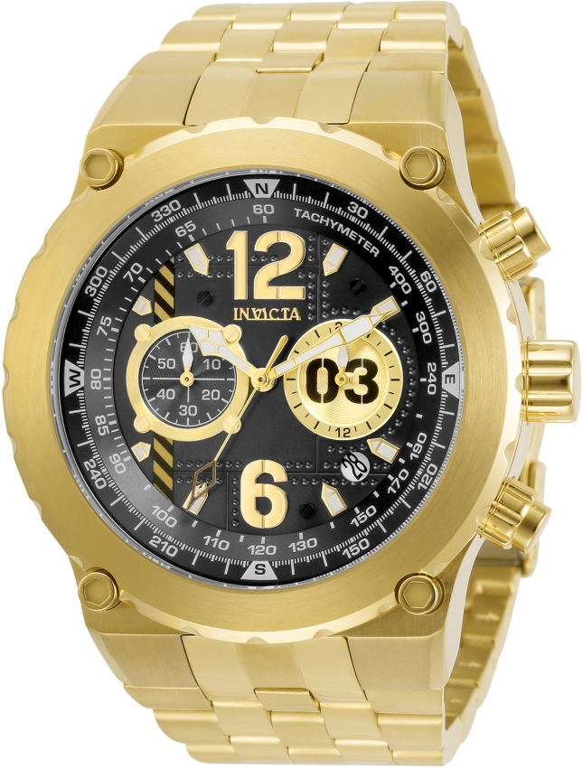 Yellow gold-tone stainless steel case and bracelet. Fixed yellow gold-tone bezel. Black dial with luminous yellow gold-tone cathedral-style hands and index hour markers. Arabic numerals mark the 6 and 12 o'clock positions. Tachymeter markers. 360 degree (compass markings) around the outer rim. Dial Type: Analog. Luminescent hands and markers. Date display between the 4 and 5 o'clock positions. Chronograph - two sub-dials displaying: 60 minute and 24 hour. SII caliber VK64 quartz movement. Scratch resistant Flame Fusion crystal. Pull / push crown. Solid case back. Round case shape. Case size: 50 mm. Case thickness: 15 mm. Band width: 32 mm. Band length: 7.5 inches. Fold over clasp. Water resistant at 100 meters / 330 feet. Functions: chronograph, date, hour, minute, second. Aviator Series. Pilot watch style. Watch label: Japan Movt. Invicta Aviator Chronograph Quartz Black Dial Mens Watch 31592.