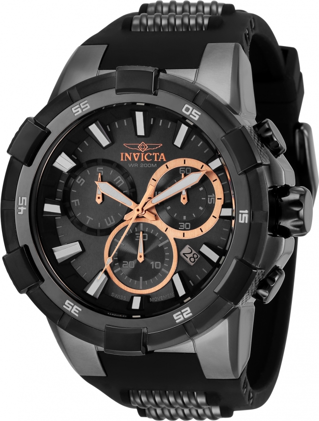 Black stainless steel case with a black stainless steel and silicone and polyurethane strap. Uni-directional rotating black and white stainless steel bezel. Black dial with rose gold-tone hands and index hour markers. Minute markers around the outer rim. Dial Type: Analog. Luminescent hands and markers. Date display between 4 and 5 o'clock position. Three sub-dials displaying: day, 60 second and 30 minute. Ronda Caliber Z60 quartz movement. Scratch resistant Flame Fusion crystal. Pull / push crown. Solid case back. Round case shape, case size: 51.5 mm, case thickness: 16 mm. Band width: 30 mm, band length: 8 inches. Buckle clasp. Water resistant at 200 meters / 660 feet. Functions: chronograph, date, day, hour, minute, small second. Aviator Series. Sport watch style. Watch label: Swiss Movt. Invicta Aviator Chronograph Quartz Black Dial Mens Watch 33291.