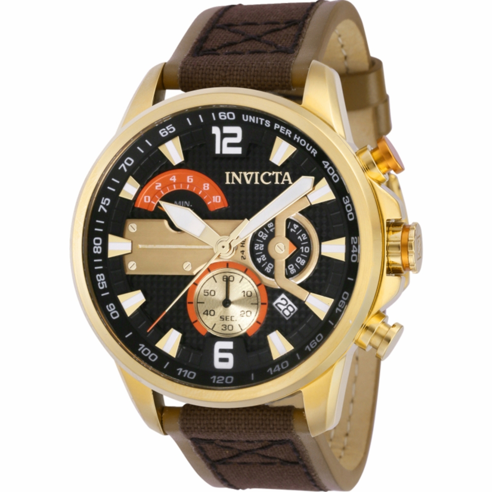 Gold-tone stainless steel case with a brown nylon and leather strap. Fixed gold-tone stainless steel bezel. Black dial with gold-tone hands and index-Arabic numeral hour markers. Tachymeter scale around the outer rim. Dial Type: Analog. Luminescent hands and markers. Date display between 4 and 5 o'clock position. Chronograph - three sub-dials displaying: 60 second, 10 minute retrograde, 24 hour. Epson Calibre VR3G quartz movement. Scratch resistant Flame Fusion crystal. Pull / push crown. Solid case back. Round case shape, case size: 46 mm, case thickness: 14 mm. Band width: 22 mm, band length: 8 inches. Buckle clasp. Water resistant at 100 meters / 330 feet. Functions: chronograph, retrograde, date, GMT, second time zone, hour, minute, second. Aviator Series. Casual watch style. Watch label: Japan Movt. Invicta Aviator Chronograph Quartz Black Dial Mens Watch 41689.