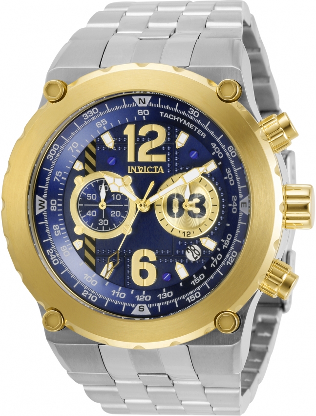 Stainless steel case with a stainless steel bracelet. Fixed yellow gold-tone bezel. Blue dial with luminous yellow gold-tone cathedral-style hands and index hour markers. Arabic numerals mark the 6 and 12 o'clock positions. Tachymeter markers. 360 degree (compass markings) around the outer rim. Dial Type: Analog. Luminescent hands and markers. Date display between the 4 and 5 o'clock positions. Chronograph - two sub-dials displaying: 60 minute and 24 hour. SII caliber VK64 quartz movement. Scratch resistant Flame Fusion crystal. Pull / push crown. Solid case back. Round case shape. Case size: 50 mm. Case thickness: 15 mm. Band width: 32 mm. Band length: 7.5 inches. Fold over clasp. Water resistant at 100 meters / 330 feet. Functions: chronograph, date, hour, minute, second. Aviator Series. Pilot watch style. Watch label: Japan Movt. Invicta Aviator Chronograph Quartz Blue Dial Mens Watch 31594.