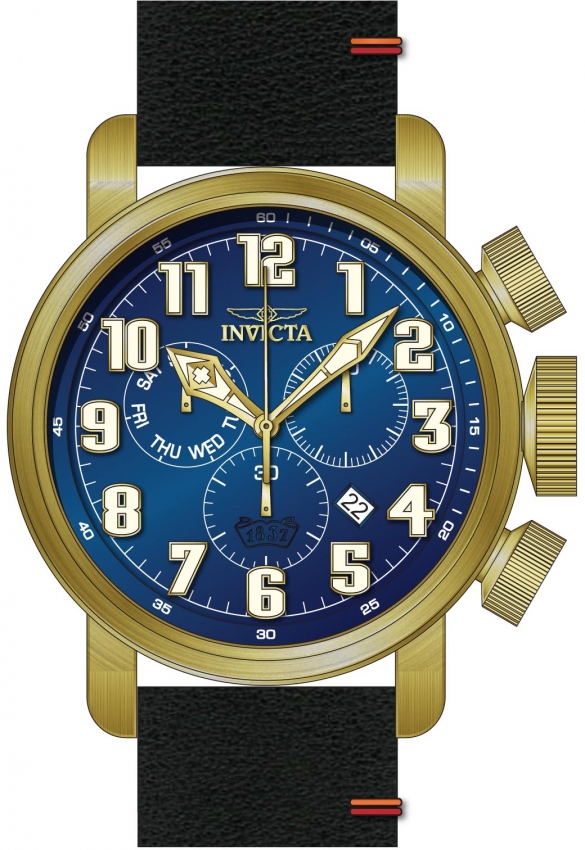 Gold-tone stainless steel case with a black leather strap. Fixed gold-tone bezel. Blue dial with luminous gold-tone hands and Arabic numeral hour markers. Minute markers around the outer rim. Dial Type: Analog. Luminescent hands and markers. Date display between 4 and 5 o'clock position. Chronograph - two sub-dials displaying: 60 second and 30 minute. Day of the week sub-dial. Ronda caliber Z60 FE quartz movement. Scratch resistant mineral crystal. Pull / push crown. Solid case back. Round case shape. Case size: 52 mm. Case thickness: 18.3 mm. Band width: 26 mm. Band length: 8.75 inches. Tang clasp. Water resistant at 100 meters / 330 feet. Functions: chronograph, date, day, hour, minute, second. Aviator Series. Sport watch style. Watch label: Swiss Movt. Invicta Aviator Chronograph Quartz Blue Dial Mens Watch 31684.