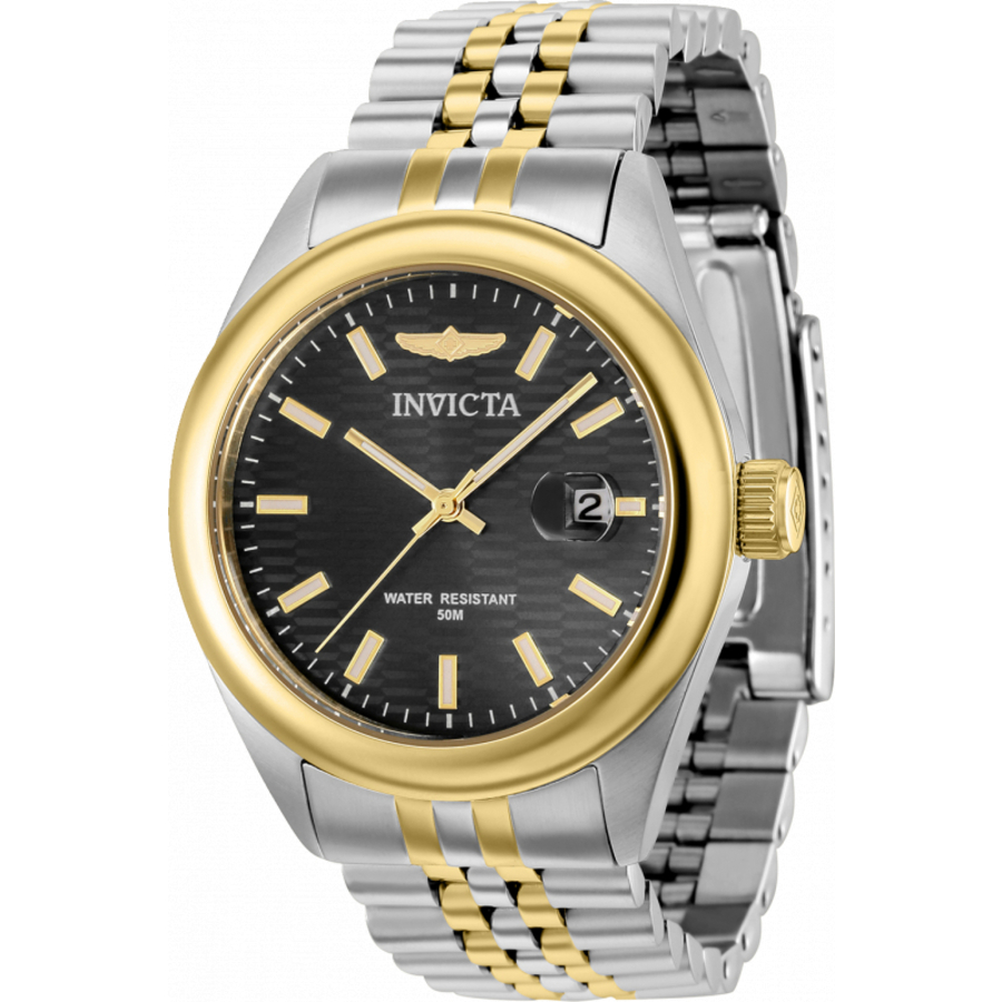 Stainless steel case with a two-tone (silver-tone and gold-tone) stainless steel bracelet. Fixed gold-tone bezel. Black dial with luminous gold-tone hands and index hour markers. Minute markers around the outer rim. Dial Type: Analog. Luminescent hands and markers. Date display at the 3 o'clock position. Hattori caliber PC32 quartz movement. Scratch resistant mineral crystal. Pull / push crown. Solid case back. Round case shape. Case size: 38 mm. Case thickness: 10.5 mm. Band width: 20 mm. Band length: 7.50 inches. Fold over clasp. Water resistant at 50 meters / 165 feet. Functions: date, hour, minute, second. Aviator Series. Casual watch style. Watch label: Japan Movt. Invicta Aviator Quartz Black Dial Ladies Watch 38430.