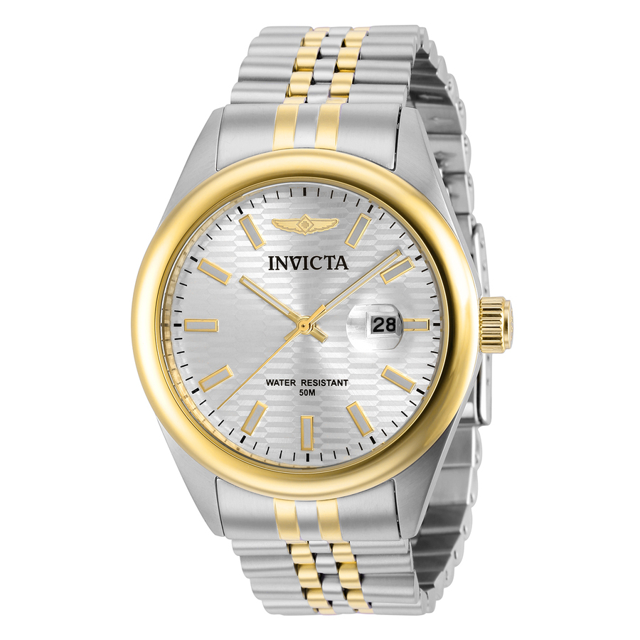 Silver-tone and gold stainless steel case with a two-tone (silver-tone and gold-tone) stainless steel bracelet. Fixed gold-tone stainless steel bezel. Silver-tone dial with gold-tone hands and index hour markers. Minute markers around the outer rim. Dial Type: Analog. Date display at the 3 o'clock position. Hattori Caliber PC32 quartz movement. Scratch resistant mineral crystal. Pull / push crown. Solid case back. Round case shape, case size: 43 mm, case thickness: 12 mm. Band width: 22 mm, band length: 8 inches. Fold over clasp. Water resistant at 50 meters / 165 feet. Functions: date, hour, minute, second. Aviator Series. Casual watch style. Watch label: Japan Movt. Invicta Aviator Quartz Silver Dial Mens Watch 38419.