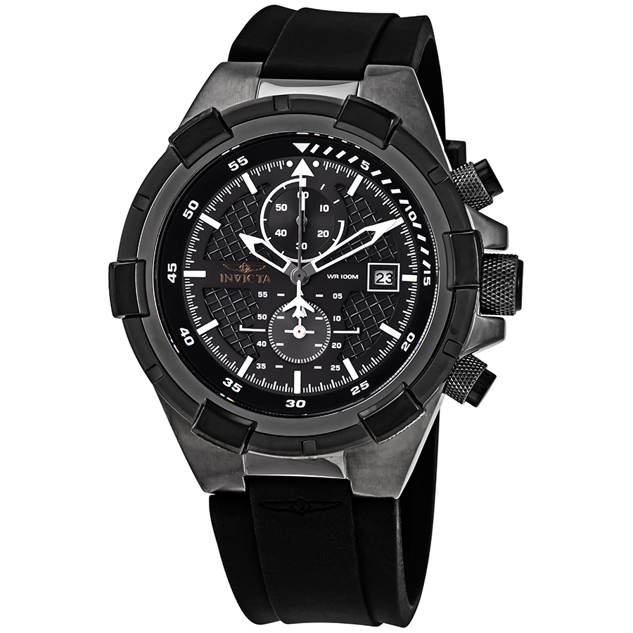 Black stainless steel case with a black silicone strap. Uni-directional rotating black stainless steel bezel. Black dial with silver-tone hands and Arabic numeral hour markers. Minute markers around the outer rim. Dial Type: Analog. Date display at the 3 o'clock position. Chronograph - two sub-dials displaying: 60 second and 60 minute. Hattori Caliber VD51 quartz movement. Scratch resistant flame fusion crystal. Pull / push crown. Solid case back. Round case shape, case size: 50 mm, case thickness: 17 mm. Band width: 26 mm, band length: 9 inches. Buckle clasp. Water resistant at 100 meters / 330 feet. Functions: chronograph, date, hour, minute, second. Sport watch style. Watch label: Japan Movt. Invicta Aviator Chronograph Black Dial Mens Watch 28099.