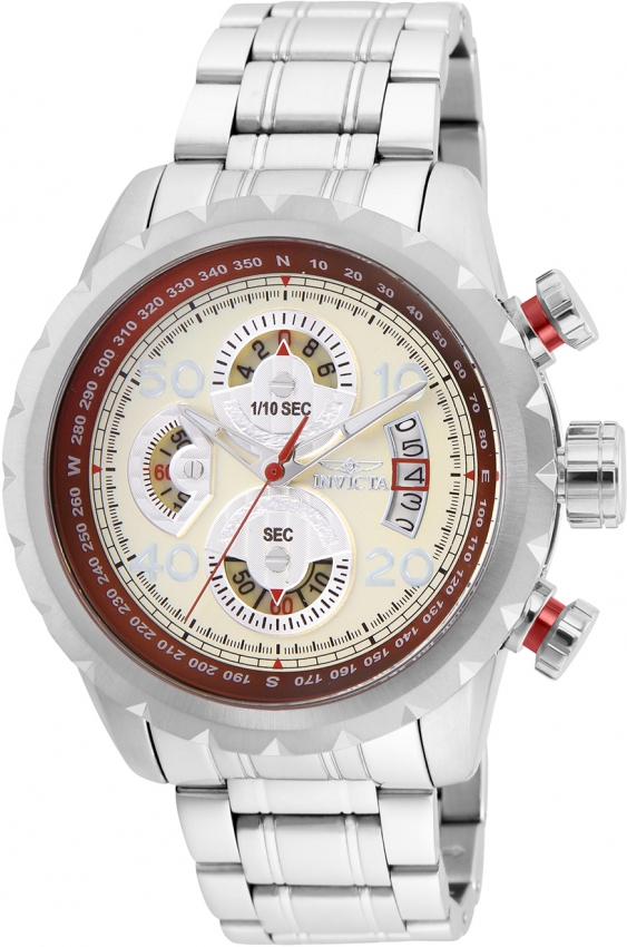 Silver-tone stainless steel case with a silver-tone stainless steel bracelet. Fixed silver-tone stainless steel bezel. Beige dial with silver-tone hands and Arabic numeral hour markers. Compass markers around the outer rim. Dial Type: Analog. Luminescent hands. Date display at the 3 o'clock position. Chronograph - sub-dials displaying: three - 60 second, 60 minute and 1/10th of a second. Hattori Caliber VD57 quartz movement. Scratch resistant flame fusion crystal. Pull / push crown. Solid case back. Round case shape, case size: 48 mm, case thickness: 17 mm. Band width: 24 mm, band length: 8.25 inches. Fold over clasp. Water resistant at 100 meters / 330 feet. Functions: chronograph, date, hour, minute, second. Sport watch style. Watch label: Japan Movt. Invicta Aviator Chronograph Mens Watch 28143.