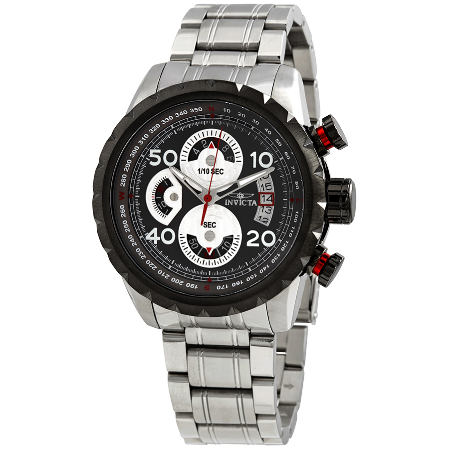 Stainless steel case with a stainless steel bracelet. Fixed gunmetal stainless steel bezel. Grey dial with luminous silver-tone hands and Arabic numeral hour markers. Minute markers. Compass markings around the outer rim. Dial Type: Analog. Luminescent hands. Date display at the 3 o'clock position. Chronograph - three sub-dials displaying: 60 second, 60 minute and 1/10th of a second. Hattori caliber VD57 quartz movement. Scratch resistant flame fusion crystal. Pull / push crown. Solid case back. Round case shape. Case size: 48 mm. Case thickness: 16 mm. Band width: 24 mm. Band length: 8 inches. Fold over clasp. Water resistant at 100 meters / 330 feet. Functions: chronograph, compass, date, hour, minute, second. Sport watch style. Watch label: Japan Movt. Invicta Aviator Chronograph Grey Dial Stainless Steel Mens Watch 28145.