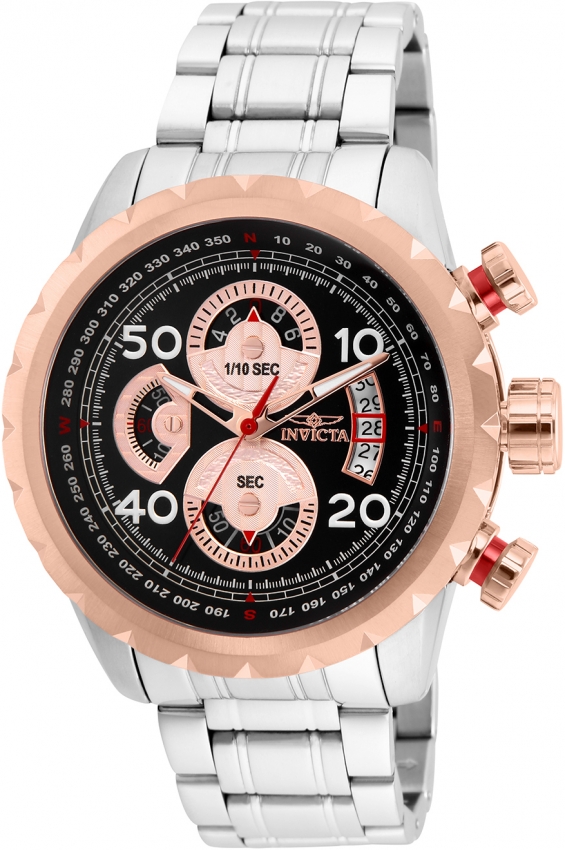 Silver-tone stainless steel case with a silver-tone stainless steel bracelet. Fixed rose gold-tone stainless steel bezel. Black dial with rose gold-tone hands and Arabic numeral hour markers. Compass markers around the outer rim. Dial Type: Analog. Luminescent hands. Date display at the 3 o'clock position. Chronograph - sub-dials displaying: three - 60 second, 60 minute and 1/10th of a second. Hattori Caliber VD57 quartz movement. Scratch resistant flame fusion crystal. Pull / push crown. Solid case back. Round case shape, case size: 48 mm, case thickness: 17 mm. Band width: 24 mm, band length: 8.25 inches. Fold over clasp. Water resistant at 100 meters / 330 feet. Functions: chronograph, date, hour, minute, second. Sport watch style. Watch label: Japan Movt. Invicta Aviator Chronograph Black Dial Mens Watch 28147.