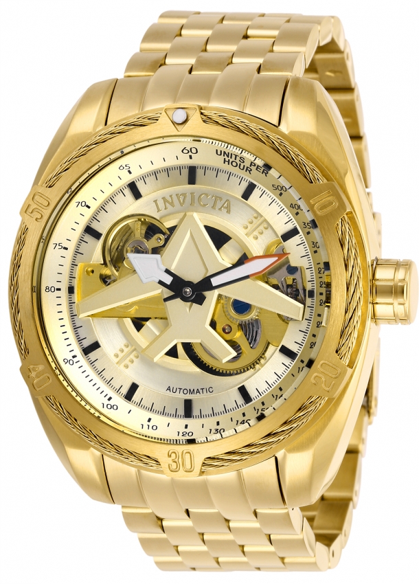 Yellow gold-tone stainless steel case and bracelet. Fixed yellow gold-tone stainless steel with yellow gold-tone cable wire trim bezel. Gold (skeleton window) dial with luminous red and black hands and index hour markers. Minute markers. Tachymeter markings around the outer rim. Dial Type: Analog. Luminescent hands. Caliber LG0801B automatic movement. Scratch resistant flame fusion crystal. Pull / push crown. Transparent case back. Round case shape. Case size: 50 mm. Case thickness: 17 mm. Band width: 32 mm. Band length: 8 inches. Fold over clasp. Water resistant at 100 meters / 330 feet. Functions: hour, minute, tachymeter. Aviator Series. Pilot watch style. Watch label: China Movt. Invicta Aviator Automatic Gold Dial Yellow Gold-tone Mens Watch 28211.
