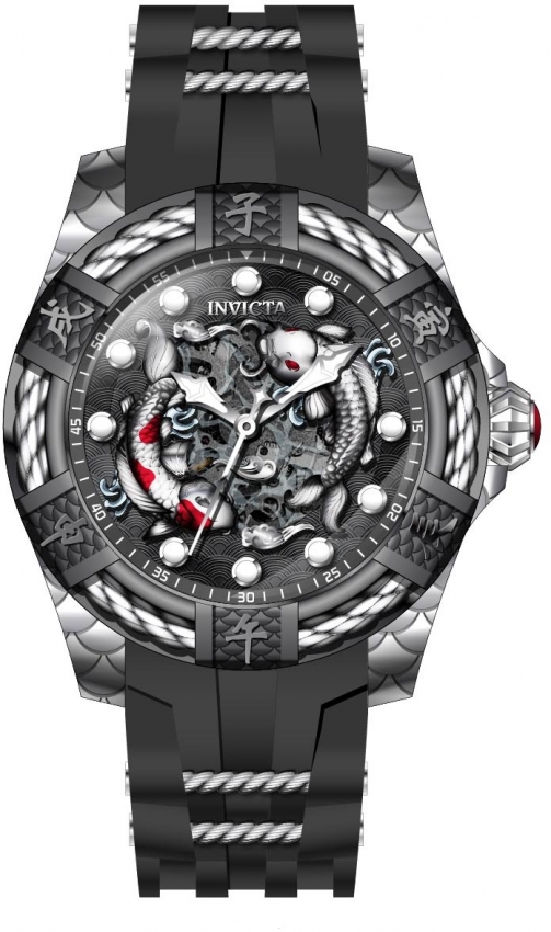 Silver-tone stainless steel case with a black and silver-tone stainless steel and silicone strap. Fixed silver-tone and gunmetal stainless steel and cable bezel. Gunmetal dial with silver-tone hands and index hour markers. Minute markers around the outer rim. Dial Type: Analog. Luminescent hands and markers. Two sub-dials displaying: 24 hour and 60 second. Caliber G2665Z automatic movement. Scratch resistant Flame Fusion crystal. Pull / push crown. Transparent see through case back. Round case shape, case size: 52 mm. Band width: 26 mm, band length: 8.25 inches. Buckle clasp. Water resistant at 100 meters / 330 feet. Functions: GMT, second time zone, hour, minute, second. Bolt Series. Invicta Bolt Automatic Gunmetal Dial Mens Watch 32338.