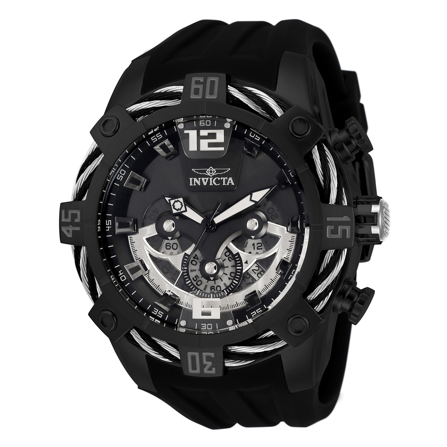 Black stainless steel case with a black silicone strap. Uni-directional rotating black and white stainless steel and cable bezel. Black dial with black hands and index-Arabic numeral hour markers. Minute markers around the outer rim. Dial Type: Analog. Luminescent hands and markers. Date display between 4 and 5 o'clock position. Chronograph - three sub-dials displaying: 60 second, 60 minute and 24 hour. Hattori Caliber VD53 quartz movement. Scratch resistant Flame Fusion crystal. Pull / push crown. Solid case back. Round case shape, case size: 51 mm, case thickness: 11 mm. Band width: 32 mm, band length: 8.25 inches. Buckle clasp. Water resistant at 100 meters / 330 feet. Functions: chronograph, date, GMT, second time zone, hour, minute, second. Bolt Series. Casual watch style. Watch label: Japan Movt. Invicta Bolt Chronograph Quartz Black Dial Mens Watch 33183.
