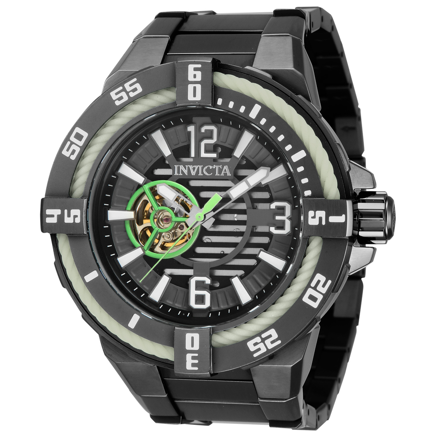 With sharpness in attitude and ability the Invicta Bolt is a mastermind of dominance. Perfectly synchronized movements complex casing engineering and signature rope jewelry design fastened around the bezel make a lasting impression. Variations in materials and finishes provide a range of options to suit any taste. The Invicta Bolt an uncompromised statement in accomplished timekeeping where power becomes harmonized motion. Black-plated stainless steel case and bracelet. Uni-directional rotating black-plated bezel. Black and grey (open heart) dial with luminous silver-tone hands and index hour markers. Arabic numerals appear at the 3, 6 and 12 o'clock positions. Minute markers around the outer rim. Dial Type: Analog. Luminescent hands and markers. TMI caliber NH38A automatic movement, containing 24 Jewels, bitting at 21600 vph, and has a power reserve of approximately 41 hours. Scratch resistant Flame Fusion crystal. Pull / push crown. Transparent case back. Round case shape, Case size: 53 mm. Case thickness: 17.35 mm. Band width: 31 mm, band length: 8.75 inches. Hidden clasp. Water resistant at 100 meters / 330 feet. Functions: hour, minute, second. Bolt Series. Casual watch style. Watch label: Japan Movt. Invicta Bolt Black Dial Mens Watch 34997.