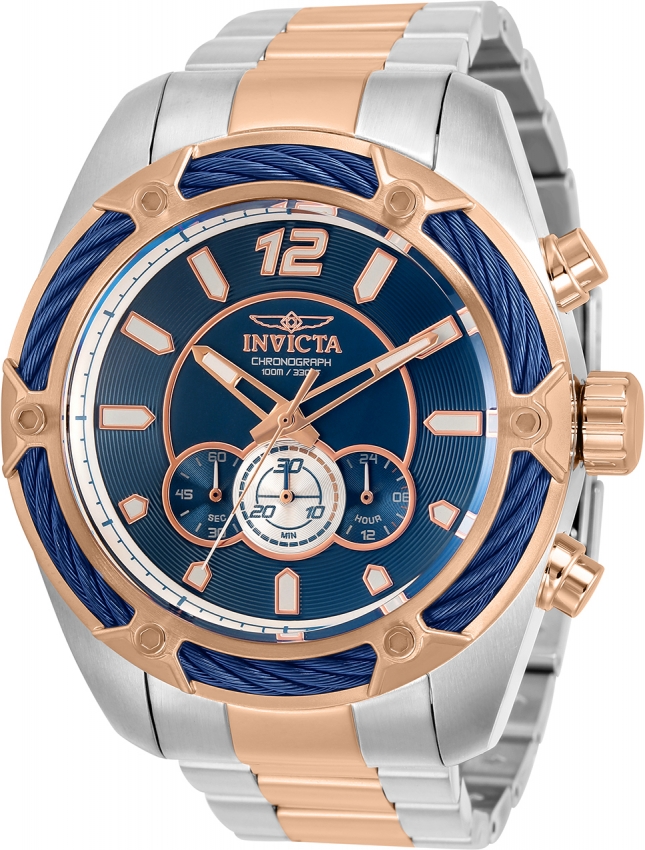 Stainless steel case with a two-tone (silver-tone and rose gold-tone) stainless steel bracelet. Fixed rose gold-tone bezel with blue cable wire trim. Blue dial with luminous rose gold-tone hands and index hour markers. An Arabic numeral appears at the 12 o'clock position. Minute markers around the outer rim. Dial Type: Analog. Luminescent hands and markers. Chronograph - three sub-dials displaying: 60 second, 60 minute and 24 hour. Hattori caliber VD53 quartz movement. Scratch resistant Flame Fusion crystal. Pull / push crown. Solid case back. Round case shape. Case size: 52 mm. Case thickness: 21.1 mm. Band width: 26 mm. Band length: 7.25 inches. Fold over clasp. Water resistant at 100 meters / 330 feet. Functions: chronograph, date, GMT, second time zone, hour, minute, second. Bolt Series. Sport watch style. Watch label: Japan Movt. Invicta Bolt Chronograph Quartz Blue Dial Mens Watch 31474.