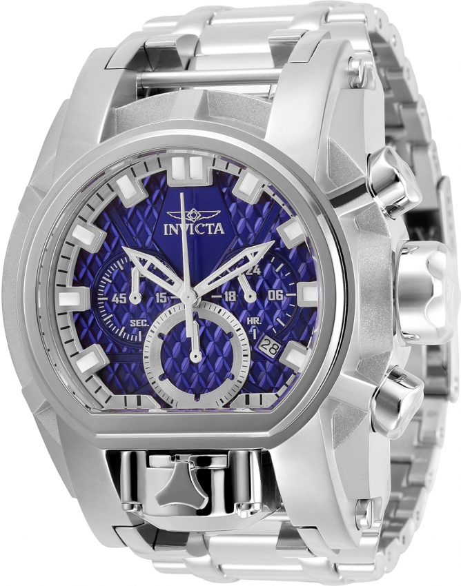 Silver-tone stainless steel case and bracelet. Fixed silver-tone stainless steel bezel. Blue dial with silver-tone hands and index hour markers. Minute markers around the outer rim. Dial Type: Analog. Luminescent hands and markers. Date display at the 4 o'clock position. Chronograph - three sub-dials displaying: 60 second, 60 minute and 24 hour. Hattori Caliber VD53 quartz movement. Scratch resistant mineral crystal. Screw down crown. Solid case back. Round case shape, case size: 52 mm, case thickness: 20.1 mm. Band width: 34 mm, band length: 8.25 inches. Fold over clasp. Water resistant at 200 meters / 660 feet. Functions: chronograph, date, GMT, second time zone, hour, minute, second. Bolt Series. Sport watch style. Watch label: Japan Movt. Invicta Bolt Chronograph Quartz Blue Dial Mens Watch 31549.