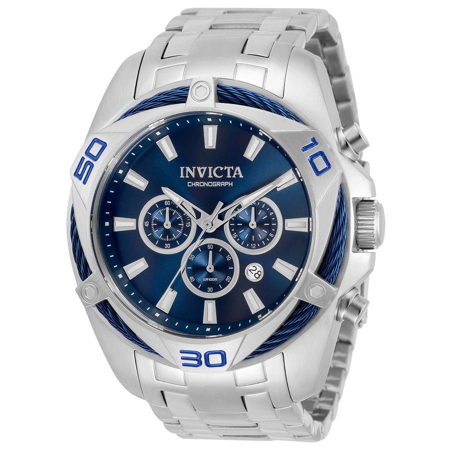 Silver-tone stainless steel case and bracelet. Fixed silver and blue stainless steel and cable bezel. Blue dial with silver-tone dauphine-style shape hands and index hour markers. Minute markers around the outer rim. Dial Type: Analog. Luminescent hands and markers. Date display between 4 and 5 o'clock position. Chronograph - three sub-dials displaying: 60 second, 60 minute and 24 hour. Hattori Caliber VD53 quartz movement. Scratch resistant Flame Fusion crystal. Pull / push crown. Solid case back. Round case shape, case size: 50 mm. Band width: 26 mm, band length: 7.25 inches. Fold over clasp with a safety release. Water resistant at 100 meters / 330 feet. Functions: chronograph, date, GMT, second time zone, hour, minute, second. Bolt Series. Casual watch style. Watch label: Japan Movt. Invicta Bolt Chronograph Quartz Blue Dial Mens Watch 32373.