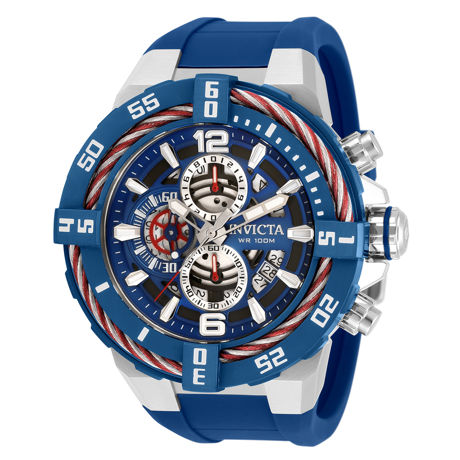 Silver-tone and blue stainless steel case with a blue silicone strap. Uni-directional rotating stainless steel bezel. Blue dial with silver-tone hands and index-Arabic numeral hour markers. Minute markers around the outer rim. Dial Type: Analog. Luminescent hands and markers. Date display at the 4 o'clock position. Chronograph - three sub-dials displaying: 60 second, 60 minute and 1/10th of a second. Hattori Caliber VD57 quartz movement. Scratch resistant Flame Fusion crystal. Pull / push crown. Solid case back. Round case shape, case size: 51 mm, case thickness: 18.15 mm. Band width: 31 mm, band length: 8.50 inches. Buckle clasp. Water resistant at 100 meters / 330 feet. Functions: chronograph, date, hour, minute, second. Bolt Series. With sharpness in attitude and ability the Invicta Bolt is a mastermind of dominance. Perfectly synchronized movements complex casing engineering and signature rope jewelry design fastened around the bezel make a lasting impression. Variations in materials and finishes provide a range of options to suit any taste. The Invicta Bolt an uncompromised statement in accomplished timekeeping where power becomes harmonized motion. Casual watch style. Watch label: Japan Movt. Invicta Bolt Chronograph Quartz Blue Dial Mens Watch 32733.