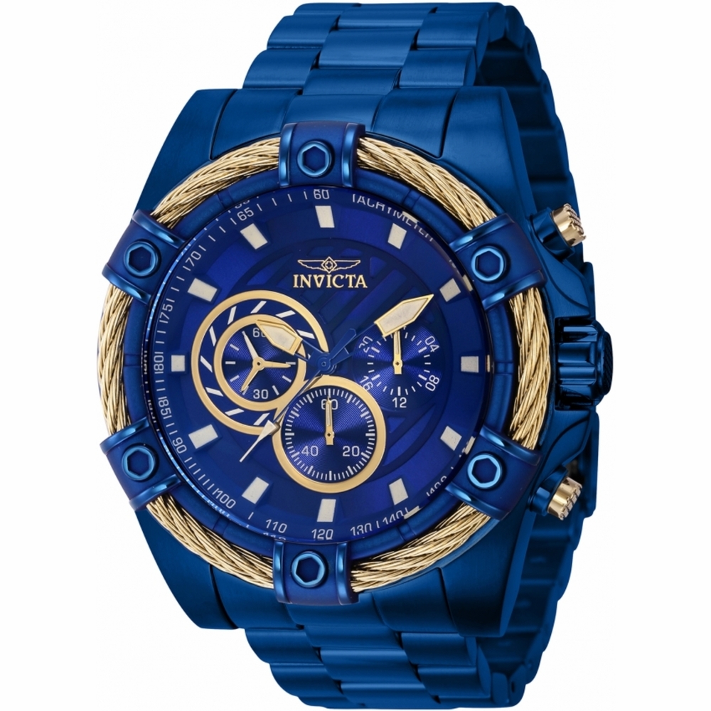 Blue stainless steel case and bracelet. Gold and blue cable and stainless steel bezel. Blue dial with gold-tone hands and index hour markers. Tachymeter scale around the outer rim. Dial Type: Analog. Luminescent hands and markers. Chronograph - three sub-dials displaying: 60 second, 60 minute and 24 hour. Hattori Caliber VD54 quartz movement. Scratch resistant Flame Fusion crystal. Screw down crown. Solid case back. Round case shape, case size: 52 mm, case thickness: 18.5 mm. Band width: 26 mm, band length: 7.25 inches. Fold over clasp. Water resistant at 100 meters / 330 feet. Functions: chronograph, GMT, second time zone, hour, minute, second. Bolt Series. Casual watch style. Watch label: Japan Movt. Invicta Bolt Chronograph Quartz Blue Dial Mens Watch 40774.