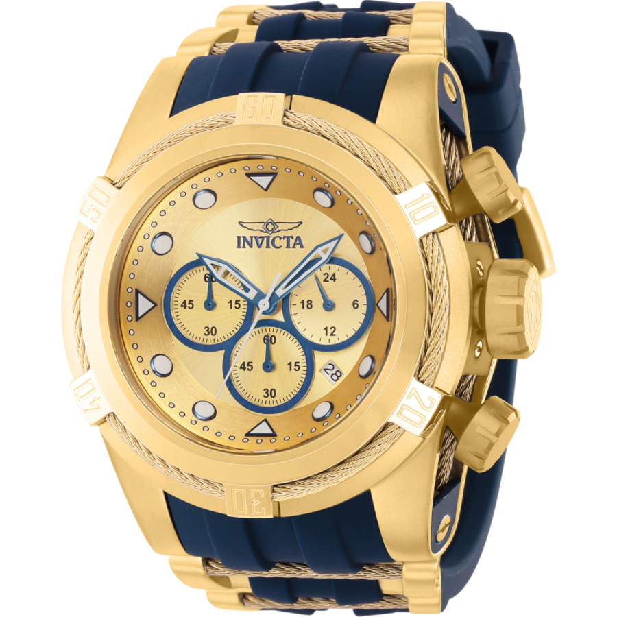 Gold-tone stainless steel case with a blue silicone strap with gold-tone cable wire inserts. Uni-directional rotating gold-tone bezel with gold-tone cable wire trim. Gold dial with blue skeleton hands and dot hour markers. Minute markers around the outer rim. Dial Type: Analog. Luminescent hands and markers. Date display between the 4 and 5 o'clock positions. Chronograph - three sub-dials displaying: 60 second, 60 minute and 24 hour. Hattori Caliber VD53 quartz movement. Scratch resistant mineral crystal. Pull / push crown. Solid case back. Round case shape. Case size: 53 mm. Case thickness: 21 mm. Band width: 35 mm. Band length: 8.25 inches. Tang clasp. Water resistant at 100 meters / 330 feet. Functions: chronograph, date, GMT, second time zone, hour, minute, second. Bolt Series. Casual watch style. Watch label: Japan Movt. Invicta Bolt Chronograph Quartz Gold Dial Mens Watch 37196.