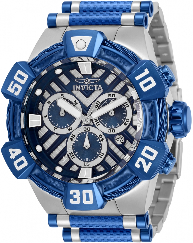 Silver-tone stainless steel case with a silver-tone and blue stainless steel and carbon fiber bracelet. Fixed blue and white stainless steel and cable bezel. Blue and silver dial with silver-tone hands and index hour markers. Dial Type: Analog. Luminescent hands and markers. Date display at the 4 o'clock position. Three sub-dials displaying: day, 60 second and 30 minute. Ronda Caliber Z60 FE quartz movement. Scratch resistant Flame Fusion crystal. Pull / push crown. Solid case back. Round case shape, case size: 52 mm. Band width: 32 mm, band length: 7.25 inches. Fold over clasp. Water resistant at 100 meters / 330 feet. Functions: chronograph, date, day, hour, minute, second. Bolt Series. Sport watch style. Watch label: Swiss Movt. Invicta Bolt Chronograph Quartz Mens Watch 32281.