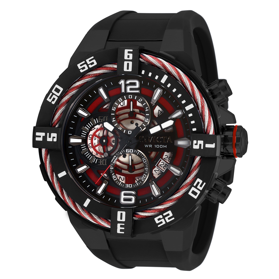 Black stainless steel case with a black silicone strap. Uni-directional rotating stainless steel bezel. Two-tone (red and black) dial with black hands and index-Arabic numeral hour markers. Minute markers around the outer rim. Dial Type: Analog. Luminescent hands and markers. Date display at the 4 o'clock position. Chronograph - three sub-dials displaying: 60 second, 60 minute and 1/10th of a second. Hattori Caliber VD57 quartz movement. Scratch resistant Flame Fusion crystal. Pull / push crown. Solid case back. Round case shape, case size: 51 mm, case thickness: 18.15 mm. Band width: 31 mm, band length: 9 inches. Buckle clasp. Water resistant at 100 meters / 330 feet. Functions: chronograph, date, hour, minute, second. Bolt Series. With sharpness in attitude and ability the Invicta Bolt is a mastermind of dominance. Perfectly synchronized movements complex casing engineering and signature rope jewelry design fastened around the bezel make a lasting impression. Variations in materials and finishes provide a range of options to suit any taste. The Invicta Bolt an uncompromised statement in accomplished timekeeping where power becomes harmonized motion. Casual watch style. Watch label: Japan Movt. Invicta Bolt Chronograph Quartz Mens Watch 32735.