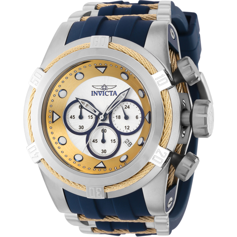 Stainless steel case with a blue silicone strap with gold-tone cable wire inserts. Uni-directional rotating stainless steel bezel with gold-tone cable wire trim. Gold (silver center) dial with black skeleton hands and dot hour markers. Minute markers around the outer rim. Dial Type: Analog. Luminescent hands and markers. Date display between the 4 and 5 o'clock positions. Chronograph - three sub-dials displaying: 60 second, 60 minute and 24 hour. Hattori caliber VD53 quartz movement. Scratch resistant mineral crystal. Pull / push crown. Solid case back. Round case shape. Case size: 53 mm. Case thickness: 21 mm. Band width: 35 mm. Band length: 8.25 inches. Tang clasp. Water resistant at 100 meters / 330 feet. Functions: chronograph, date, GMT, second time zone, hour, minute, second. Bolt Series. Casual watch style. Watch label: Japan Movt. Invicta Bolt Chronograph Quartz Silver Dial Mens Watch 37193.