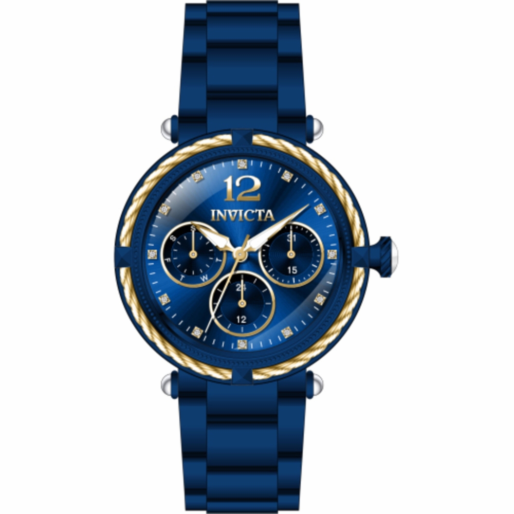 Blue stainless steel case and bracelet. Fixed two-tone (gold and blue) cable and stainless steel bezel. Blue dial with gold-tone hands and crystal hour markers. Minute markers around the outer rim. Dial Type: Analog. Luminescent hands. Date display at the 3 o'clock position. Three sub-dials displaying: date, day and 24 hour. TMI Caliber VH63 quartz movement. Scratch resistant Flame Fusion crystal. Pull / push crown. Solid case back. Round case shape, case size: 36.5 mm, case thickness: 11 mm. Band width: 18 mm, band length: 7.75 inches. Fold over clasp. Water resistant at 100 meters / 330 feet. Functions: date, day, GMT, second time zone, hour, minute, second. Bolt Series. Casual watch style. Watch label: Japan Movt. Invicta Bolt Quartz Crystal Blue Dial Unisex Watch 43887.