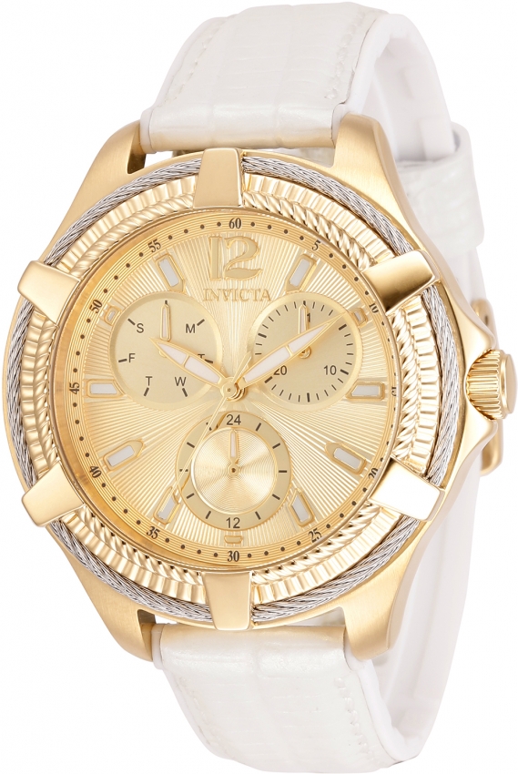 Yellow gold-tone stainless steel case with a white leather strap. Fixed yellow gold-tone bezel with silver-tone cable wire trim. Gold dial with luminous yellow gold-tone hands and index hour markers. An Arabic numeral appears at the 12 o'clock position. Arabic numeral minute markers (at 5 minute intervals). Minute markers around the outer rim. Dial Type: Analog. Luminescent hands and markers. Three multi-function sub-dials displaying: date, day of the week and 24 hour. Caliber VH68 quartz movement. Scratch resistant Flame Fusion crystal. Pull / push crown. Solid case back. Round case shape. Case size: 41 mm. Case thickness: 11 mm. Band width: 18 mm. Band length: 7.50 inches. Tang clasp. Water resistant at 100 meters / 330 feet. Functions: date, day, GMT, second time zone, hour, minute, second. Bolt Series. Casual watch style. Watch label: Japan Movt. Invicta Bolt Quartz Gold Dial White Leather Ladies Watch 30886.