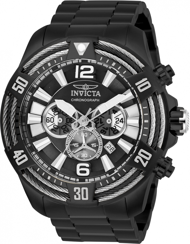 Black stainless steel case with a black stainless steel bracelet. Uni-directional rotating two-tone (black and silver-tone) stainless steel and cable bezel. Black dial with silver-tone hands and Arabic numeral and index hour markers. Minute markers around the outer rim. Dial Type: Analog. Luminescent hands and markers. Date display between 4 and 5 o'clock position. Chronograph - sub-dials displaying: three - 60 second, 60 minute and 24 hour. Hattori Caliber VD53 quartz movement. Scratch resistant flame fusion crystal. Pull / push crown. Solid case back. Round case shape, case size: 53 mm, case thickness: 18 mm. Band width: 26 mm, band length: 8.5 inches. Fold over clasp. Water resistant at 100 meters / 330 feet. Functions: chronograph, date, GMT, second time zone, hour, minute, second. Sport watch style. Watch label: Japan Movt. Invicta Bolt Chronograph Black Dial Mens Watch 27270.