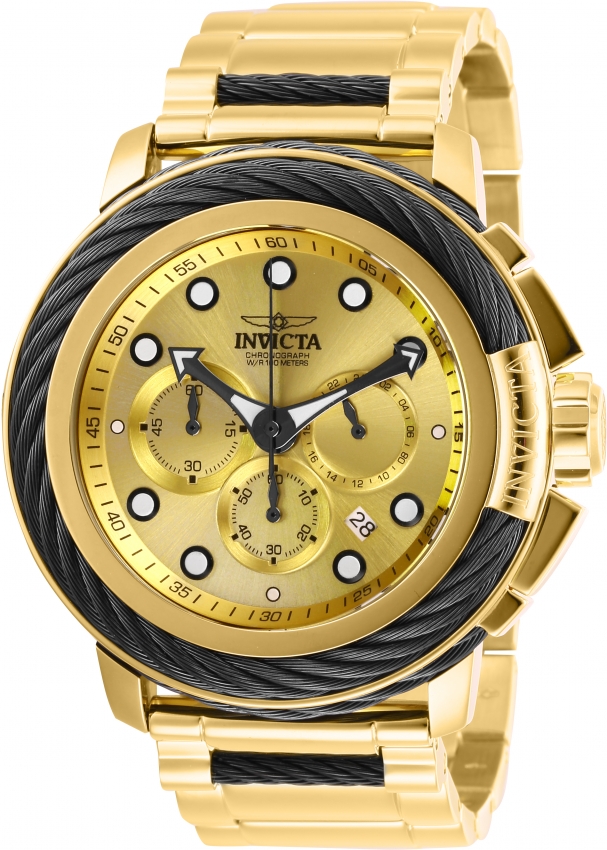 Gold-tone stainless steel case with a gold-tone stainless steel with black cable wire accents. Fixed gold-tone bezel with black cable wire trim. Gold dial with luminous black hands and dot hour markers. Minute markers around the outer rim. Dial Type: Analog. Luminescent hands and markers. Date display between the 4 and 5 o'clock positions. Chronograph - three sub-dials displaying: 60 second, 60 minute and 24 hour. Hattori caliber VD53 quartz movement. Scratch resistant mineral crystal. Pull / push crown. Solid case back. Round case shape. Case size: 52 mm. Case thickness: 18 mm. Band width: 26 mm. Band length: 8.25 inches. Fold over clasp. Water resistant at 100 meters / 330 feet. Functions: chronograph, date, GMT, second time zone, hour, minute, second. Sport watch style. Watch label: Japan Movt. Invicta Bolt Chronograph Gold Dial Mens Watch 27494.