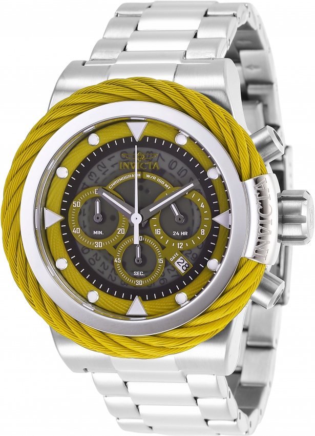 Silver-tone stainless steel case with a silver-tone stainless steel bracelet. Fixed silver-tone and yellow stainless steel bezel. Gold-tone dial with gunmetal hands and index hour markers. Minute markers around the outer rim. Dial Type: Analog. Luminescent hands and markers. Date display between 4 and 5 o'clock position. Chronograph - sub-dials displaying: three - 60 second, 60 minute and 24 hour. Hattori Caliber VD53 quartz movement. Scratch resistant mineral crystal. Pull / push crown. Solid case back. Round case shape, case size: 50 mm, case thickness: 16.6 mm. Band width: 24 mm, band length: 8.25 inches. Fold over clasp. Water resistant at 100 meters / 330 feet. Functions: chronograph, date, GMT, second time zone, hour, minute, second. Sport watch style. Watch label: Japan Movt. Invicta Bolt Chronograph Quartz Gold Dial Mens Watch 27799.