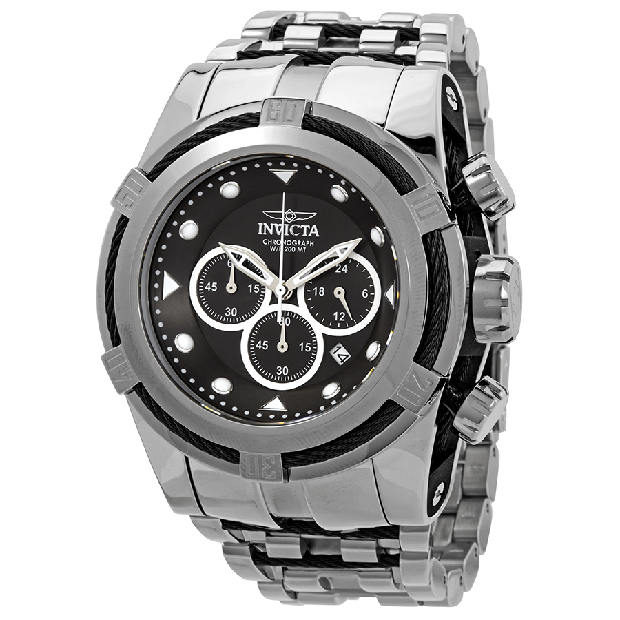 Stainless steel case with a stainless steel bracelet with black cable wire accents. Uni-directional rotating stainless steel bezel with black cable wire trim. Black dial with silver-tone skeleton hands and index hour markers. Minute markers around the outer rim. Dial Type: Analog. Luminescent hands and markers. Date display at the 4 o'clock position. Chronograph - three sub-dials displaying: 60 second, 60 minute and 24 hours. Hattori caliber VD53 quartz movement. Scratch resistant mineral crystal. Screw down crown. Solid case back. Round case shape. Case size: 53 mm. Case thickness: 21 mm. Band width: 35 mm. Band length: 8.25 inches. Deployment clasp. Water resistant at 200 meters / 660 feet. Functions: chronograph, date, hour, minute, second. Sport watch style. Watch label: Japan Movt. Invicta Bolt Black Dial Mens Chronograph Watch 27846.