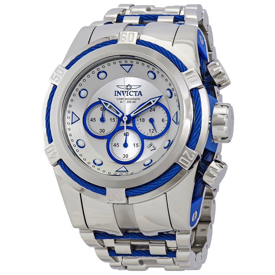 Two-tone (silver-tone and blue) stainless steel, plastic case with a two-tone (silver-tone and blue) stainless steel bracelet. Uni-directional rotating two-tone (silver-tone and blue) stainless steel bezel. Silver, blue dial with blue hands and index hour markers. Minute markers around the outer rim. Dial Type: Analog. Luminescent hands and markers. Date display between 4 and 5 o'clock position. Chronograph - three sub-dials displaying: 60 second, 60 minute and 24 hours. Hattori Caliber VD53 quartz movement. Scratch resistant mineral crystal. Screw down crown. Solid case back. Round case shape, case size: 53 mm, case thickness: 21 mm. Band width: 35 mm, band length: 8.25 inches. Deployment clasp. Water resistant at 200 meters / 660 feet. Functions: chronograph, date, hour, minute, second. Sport watch style. Watch label: Japan Movt. Invicta Bolt Silver-Blue Dial Mens Chronograph Watch 27852.