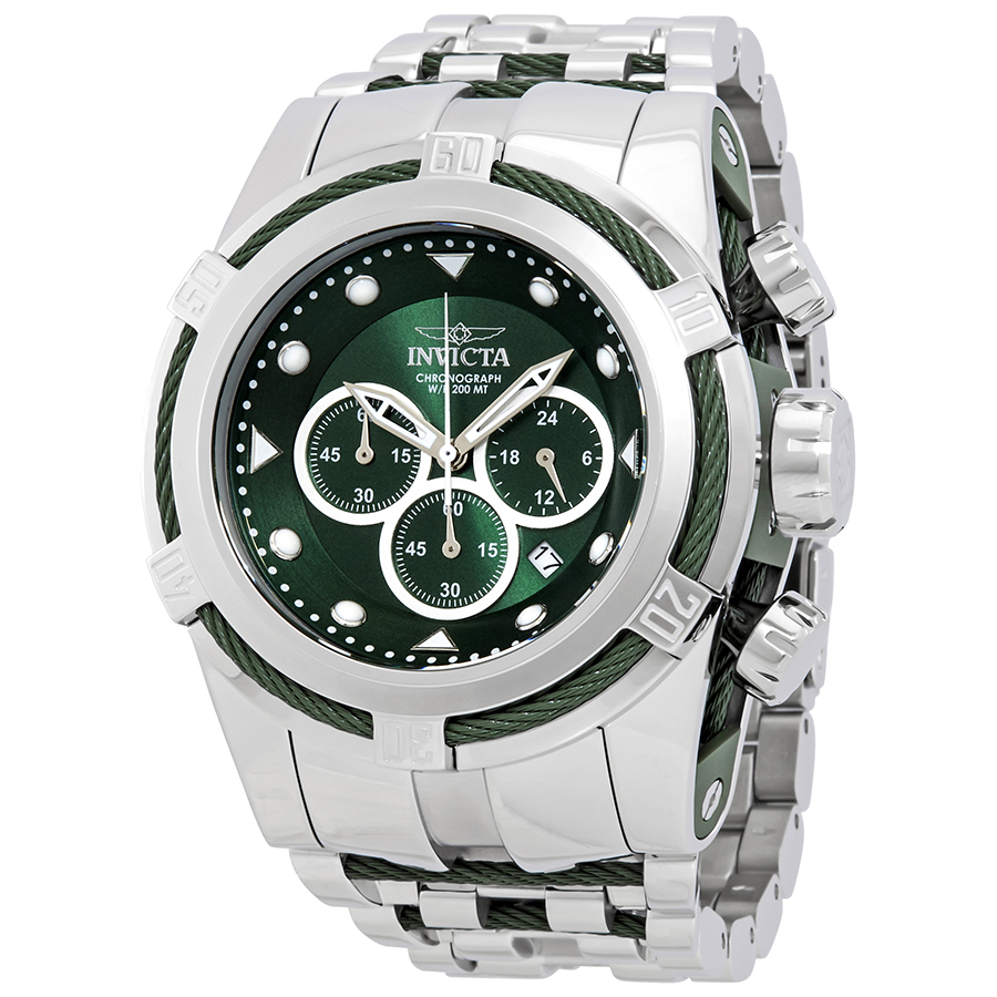 Stainless steel, green stainless steel, plastic case with a stainless steel bracelet. Silver-tone and green stainless steel bezel. Green dial with silver-tone hands and dot hour markers. Minute markers around the outer rim. Dial Type: Analog. Luminescent hands and markers. Date display between 4 and 5 o'clock position. Chronograph - three sub-dials displaying: 60 second, 60 minute and 24 hours. Hattori Caliber VD53 quartz movement. Scratch resistant mineral crystal. Screw down crown. Solid case back. Round case shape, case size: 53 mm, case thickness: 21 mm. Band length: 8.25 inches. Deployment clasp. Water resistant at 200 meters / 660 feet. Functions: chronograph, date, hour, minute, second. Sport watch style. Watch label: Japan Movt. Invicta Bolt Green Dial Mens Chronograph Watch 27855.