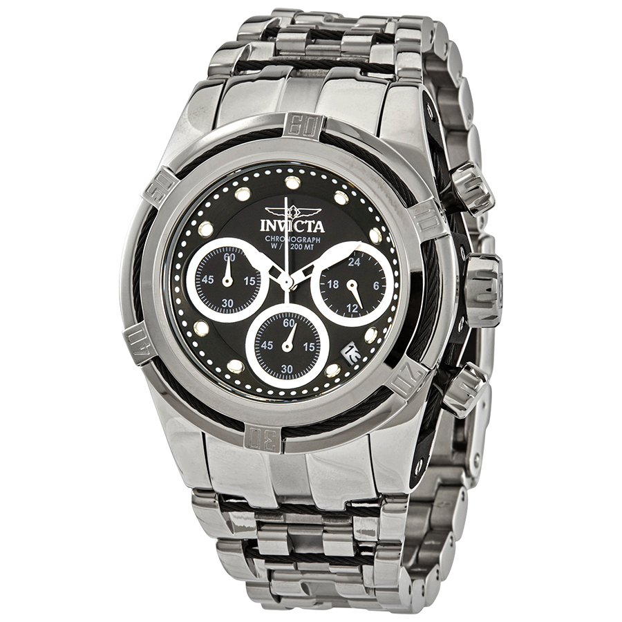 Silver-tone stainless steel case with a silver-tone stainless steel bracelet. Uni-directional rotating silver-tone and black stainless steel bezel. Black dial with silver-tone hands and index hour markers. Minute markers around the outer rim. Dial Type: Analog. Luminescent hands and markers. Date display between 4 and 5 o'clock position. Chronograph - sub-dials displaying: three - 60 second, 60 minute and 24 hours. Hattori Caliber VD53 quartz movement. Scratch resistant mineral crystal. Screw down crown. Solid case back. Round case shape, case size: 42 mm, case thickness: 16.25 mm. Deployment clasp. Water resistant at 200 meters / 660 feet. Functions: chronograph, date, hour, minute, second. Sport watch style. Watch label: Japan Movt. Invicta Bolt Chronograph Quartz Black Dial Ladies Watch 27856.