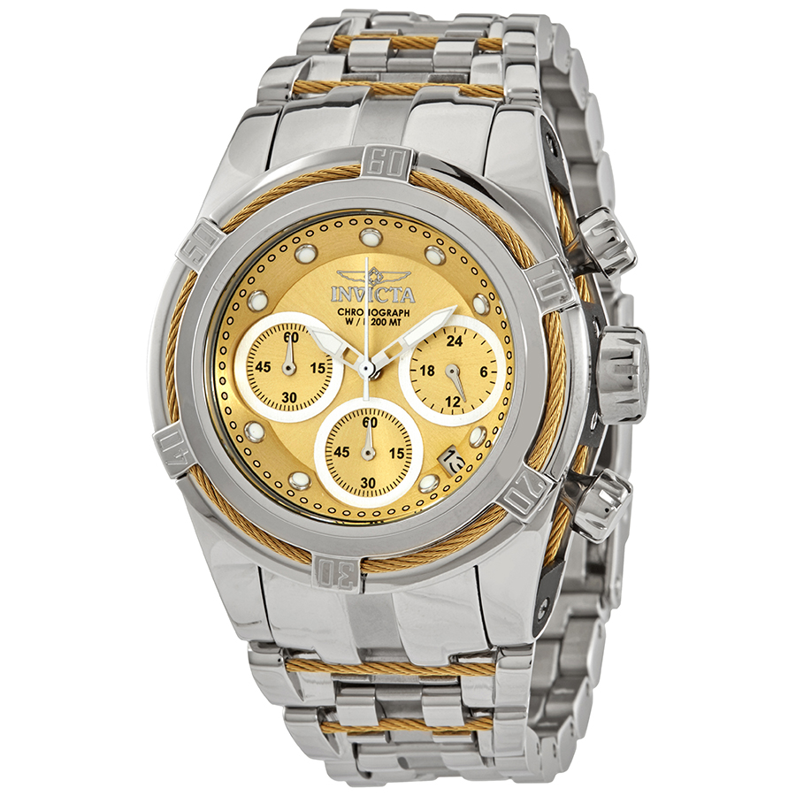 Silver-tone stainless steel case with a two-tone (silver-tone and gold-tone) stainless steel bracelet. Uni-directional rotating two-tone (silver-tone and gold-tone) stainless steel bezel. Gold, silver dial with silver-tone hands and index hour markers. Minute markers around the outer rim. Dial Type: Analog. Luminescent hands and markers. Date display between 4 and 5 o'clock position. Chronograph - three sub-dials displaying: 60 second, 60 minute and 24 hours. Hattori Caliber VD53 quartz movement. Scratch resistant mineral crystal. Screw down crown. Solid case back. Round case shape, case size: 42 mm, case thickness: 16.25 mm. Band width: 27 mm, band length: 7.5 inches. Fold over clasp. Water resistant at 200 meters / 660 feet. Functions: chronograph, date, hour, minute, second. Sport watch style. Watch label: Japan Movt. Invicta Bolt Gold-tone Dial Mens Chronograph Watch 27857.