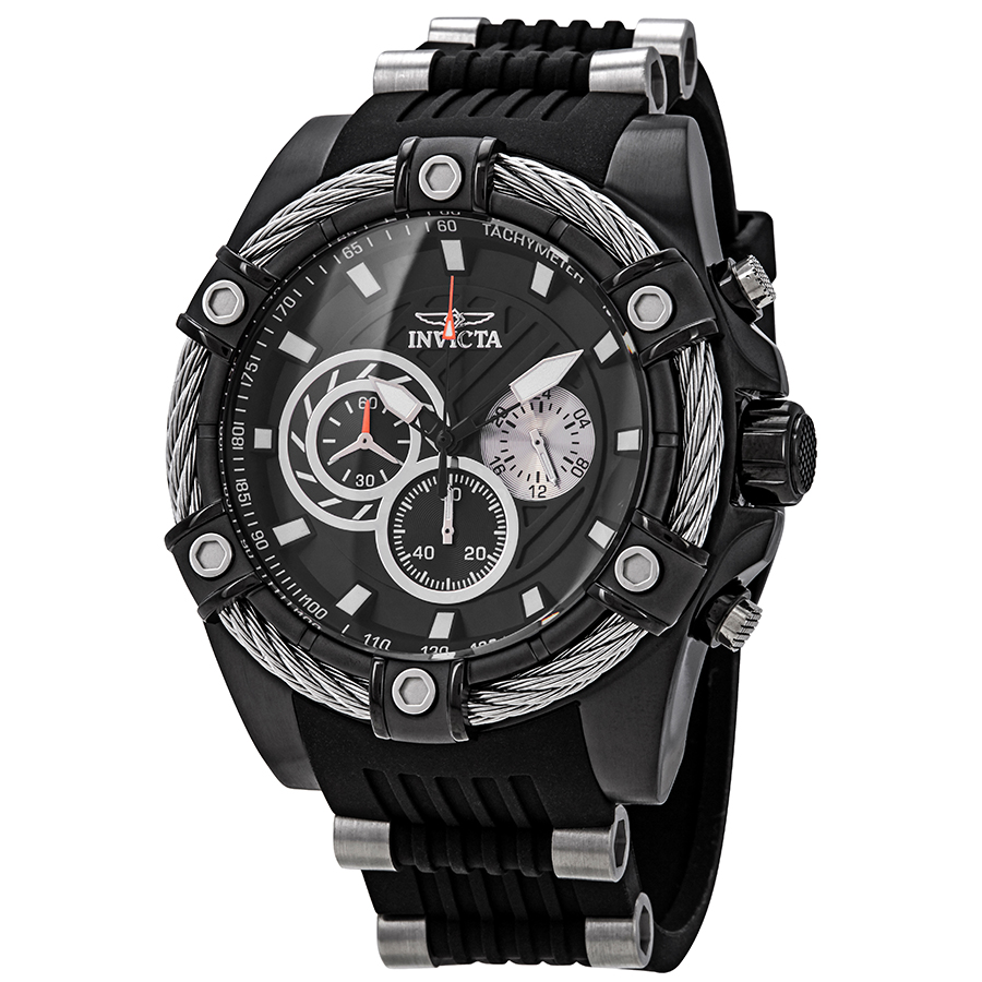 Black ion-plated stainless steel case with a black silicone strap with stainless steel inserts. Fixed black ion-plated bezel with silver-tone cable wire trim. Black dial with luminous silver-tone hands and index hour markers. Tachymeter markers around the outer rim. Dial Type: Analog. Luminescent hands and markers. Chronograph - three sub-dials displaying: 60 second, 60 minute and 24 hour. Hattori caliber VD54 quartz movement. Scratch resistant flame fusion crystal. Pull / push crown. Solid case back. Round case shape. Case size: 52 mm. Case thickness: 18 mm. Band width: 26 mm. Band length: 7.75 inches. Tang clasp. Water resistant at 100 meters / 330 feet. Functions: chronograph, hour, minute, second. Sport watch style. Watch label: Japan Movt. Invicta Bolt Chronograph Black Dial Mens Watch 28016.