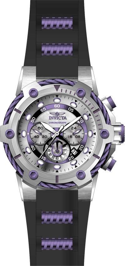 Silver-tone stainless steel case with a two-tone (black and purple) silicone and stainless steel strap. Fixed silver-tone stainless steel bezel. Silver-tone dial with silver-tone hands and index hour markers. Minute markers around the outer rim. Dial Type: Analog. Luminescent hands and markers. Date display between 4 and 5 o'clock position. Chronograph - sub-dials displaying: three - 60 second, 60 minute and 24 hour. Hattori Caliber VD53 quartz movement. Scratch resistant flame fusion crystal. Pull / push crown. Solid case back. Round case shape, case size: 52 mm, case thickness: 18 mm. Band width: 32 mm, band length: 9 inches. Buckle clasp. Water resistant at 100 meters / 330 feet. Functions: chronograph, date, GMT, second time zone, hour, minute, second. Sport watch style. Watch label: Japan Movt. Invicta Bolt Chronograph Silver Dial Mens Watch 28038.