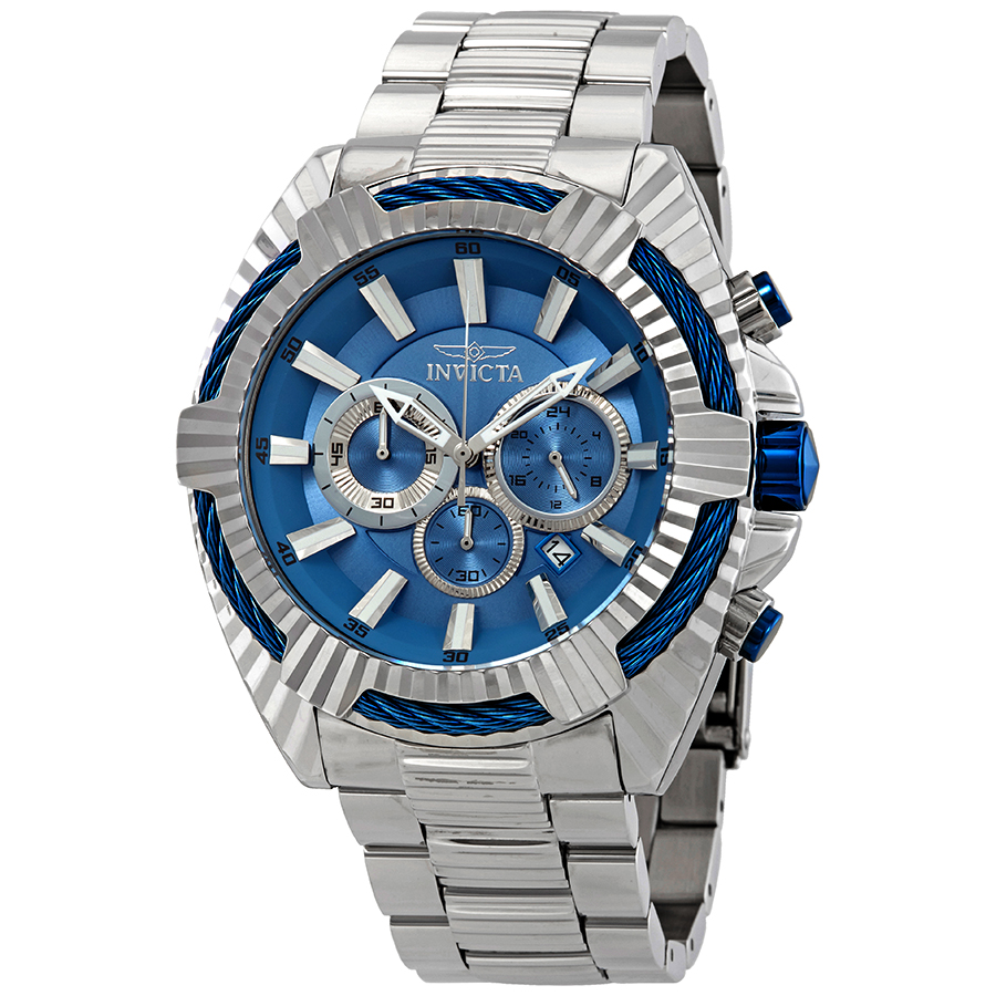 Silver-tone stainless steel case with a silver-tone stainless steel bracelet. Fixed blue and silver-tone stainless steel bezel. Blue dial with silver-tone hands and Arabic numeral hour markers. Dial Type: Analog. Luminescent hands and markers. Date display between 4 and 5 o'clock position. Chronograph - three sub-dials displaying: 60 second, 60 minute and 24 hour. Hattori Caliber VD53 quartz movement. Scratch resistant flame fusion crystal. Pull / push crown. Solid case back. Round case shape, case size: 50 mm, case thickness: 18 mm. Band width: 26 mm. Fold over clasp. Water resistant at 100 meters / 330 feet. Functions: chronograph, date, hour, minute, second. Sport watch style. Watch label: Japan Movt. Invicta Bolt Chronograph Blue Dial Mens Watch 28045.