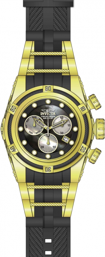 Gold-tone stainless steel case with a two-tone (black and gold-tone) silicone and stainless steel strap. Uni-directional rotating two-tone (black and gold-tone) stainless steel bezel. Black mother of pearl dial with gold-tone hands and index hour markers. Dial Type: Analog. Luminescent hands and markers. Date display at the 4 o'clock position. Chronograph - three sub-dials displaying: week, 60 second, 30 minute. Ronda Caliber Z60 quartz movement. Scratch resistant mineral crystal. Screw down crown. Solid case back. Round case shape, case size: 53 mm, case thickness: 22 mm. Band width: 30.5 mm, band length: 8.25 inches. Buckle clasp. Water resistant at 200 meters / 660 feet. Functions: chronograph, date, day, hour, minute, small second. Sport watch style. Watch label: Swiss Movt. Invicta Bolt Chronograph Mens Watch 28157.