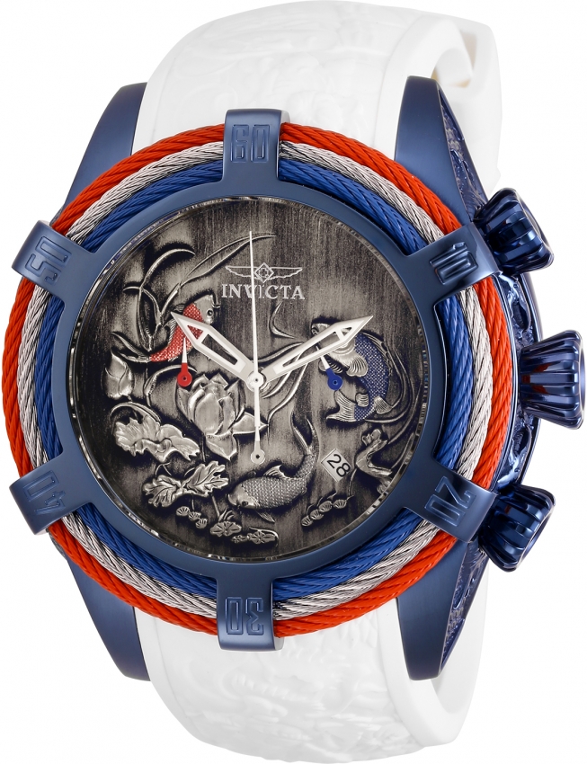 Blue stainless steel case with a white silicone strap. Uni-directional rotating multicolor stainless steel bezel. Black dial with silver-tone hands. Dial Type: Analog. Luminescent hands. Date display between 4 and 5 o'clock position. Chronograph - three sub-dials displaying: 60 second, 60 minute and 24 hour. Hattori Caliber VD53 quartz movement. Scratch resistant flame fusion crystal. Screw down crown. Solid case back. Round case shape, case size: 53.8 mm, case thickness: 20 mm. Band width: 26 mm, band length: 8.25 inches. Buckle clasp. Water resistant at 200 meters / 660 feet. Functions: chronograph, date, GMT, second time zone, hour, minute, second. Sport watch style. Watch label: Japan Movt. Invicta Bolt Koi Fish Chronograph Black Dial Mens Watch 28219.