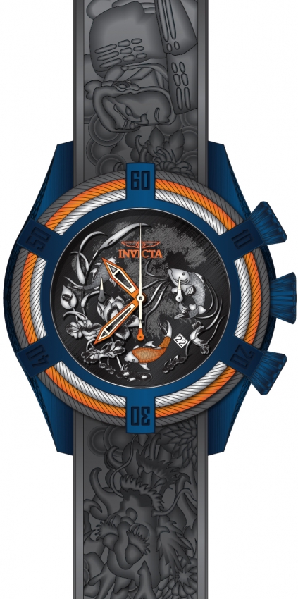 Blue stainless steel case with a grey silicone strap. Uni-directional rotating multicolor stainless steel bezel. Black dial with orange hands. Dial Type: Analog. Luminescent hands. Date display between 4 and 5 o'clock position. Chronograph - three sub-dials displaying: 60 second, 60 minute and 24 hour. Hattori Caliber VD53 quartz movement. Scratch resistant flame fusion crystal. Screw down crown. Solid case back. Round case shape, case size: 53.8 mm, case thickness: 20 mm. Band width: 26 mm, band length: 8.25 inches. Buckle clasp. Water resistant at 200 meters / 660 feet. Functions: chronograph, date, GMT, second time zone, hour, minute, second. Sport watch style. Watch label: Japan Movt. Invicta Bolt Chronograph Black Dial Mens Watch 28221.