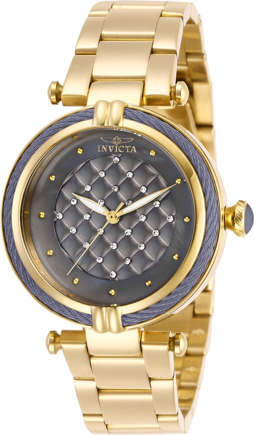 Yellow gold-tone stainless steel case and bracelet. Fixed yellow gold-tone bezel with gunmetal cable wire trim. Quilted gunmetal (crystal-set) dial with luminous yellow gold-tone hands and dot hour markers. Dial Type: Analog. Luminescent hands. Hattori caliber PC21 quartz movement. Scratch resistant flame fusion crystal. Pull / push crown. Solid case back. Round case shape. Case size: 36.5 mm. Case thickness: 11 mm. Band width: 18 mm. Fold over clasp with a push button release. Water resistant at 100 meters / 330 feet. Functions: hour, minute, second. Bolt Series. Dress watch style. Watch label: Japan Movt. Invicta Bolt Ladies Watch 28929.