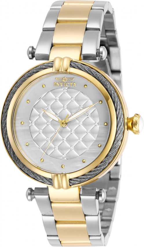 Stainless steel case with a two-tone (silver-tone and yellow gold-tone) stainless steel bracelet. Fixed yellow gold-tone bezel with an inlaid silver-tone cable wire trim. White (quilt-pattern) (crystal-set) dial with luminous yellow gold-tone hands and dot hour markers. Dial Type: Analog. Luminescent hands. Hattori caliber PC21 quartz movement. Scratch resistant Flame Fusion crystal. Pull / push crown. Solid case back. Round case shape. Case size: 36.5 mm. Band width: 18 mm. Fold over clasp. Water resistant at 100 meters / 330 feet. Functions: hour, minute, second. Bolt Series. Dress watch style. Watch label: Japan Movt. Invicta Bolt White Dial Two-tone Ladies Watch 28934.