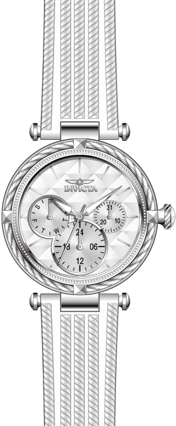 Stainless steel case with a white polyurethane strap. Fixed stainless steel bezel with silver-tone cable wire trim. White dial with luminous silver-tone alpha-style hands and index hour markers. Dial Type: Analog. Luminescent hands. Three multi-function sub-dials displaying: date, day of the week and 24 hour. TMI caliber VH63 quartz movement. Scratch resistant flame fusion crystal. Pull / push crown. Solid case back. Round case shape. Case size: 36 mm. Case thickness: 11 mm. Band width: 18 mm, band length: 7.75 inches. Tang clasp. Water resistant at 100 meters / 330 feet. Functions: date, day, GMT, second time zone, hour, minute, second. Bolt Series. Sport watch style. Watch label: Japan Movt. Invicta Bolt Quartz White Dial White Polyurethane Ladies Watch 28964