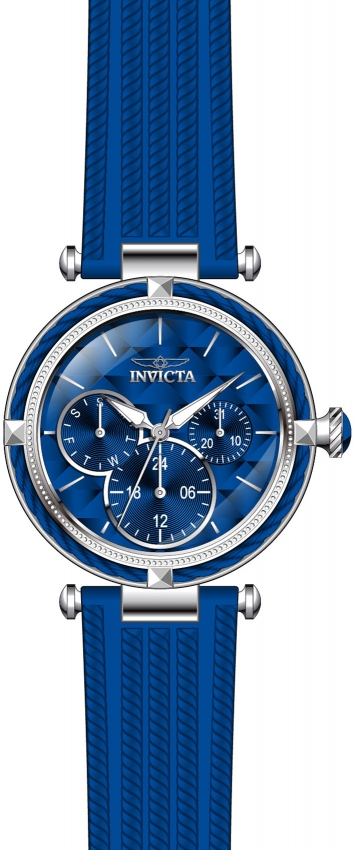 Stainless steel case with a blue polyurethane strap. Fixed stainless steel bezel with blue cable wire trim. Blue dial with luminous silver-tone alpha-style hands and index hour markers. Dial Type: Analog. Luminescent hands. Three multi-function sub-dials displaying: date, day of the week and 24 hour. TMI caliber VH63 quartz movement. Scratch resistant flame fusion crystal. Pull / push crown. Solid case back. Round case shape. Case size: 36 mm. Case thickness: 11 mm. Band width: 18 mm, band length: 7.75 inches. Tang clasp. Water resistant at 100 meters / 330 feet. Functions: date, day, GMT, second time zone, hour, minute, second. Bolt Series. Sport watch style. Watch label: Japan Movt. Invicta Bolt Quartz Blue Dial Blue Polyurethane Ladies Watch 28965.
